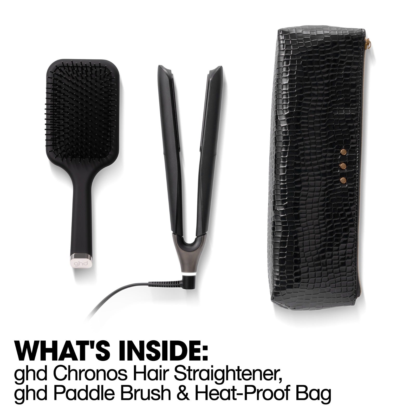 Featuring our #1 styler– the ghd Chronos™professional HD motion-responsive styler – this luxurious gift set is completed with the All-Rounder Paddle Brush and a heat-resistant bag.¹