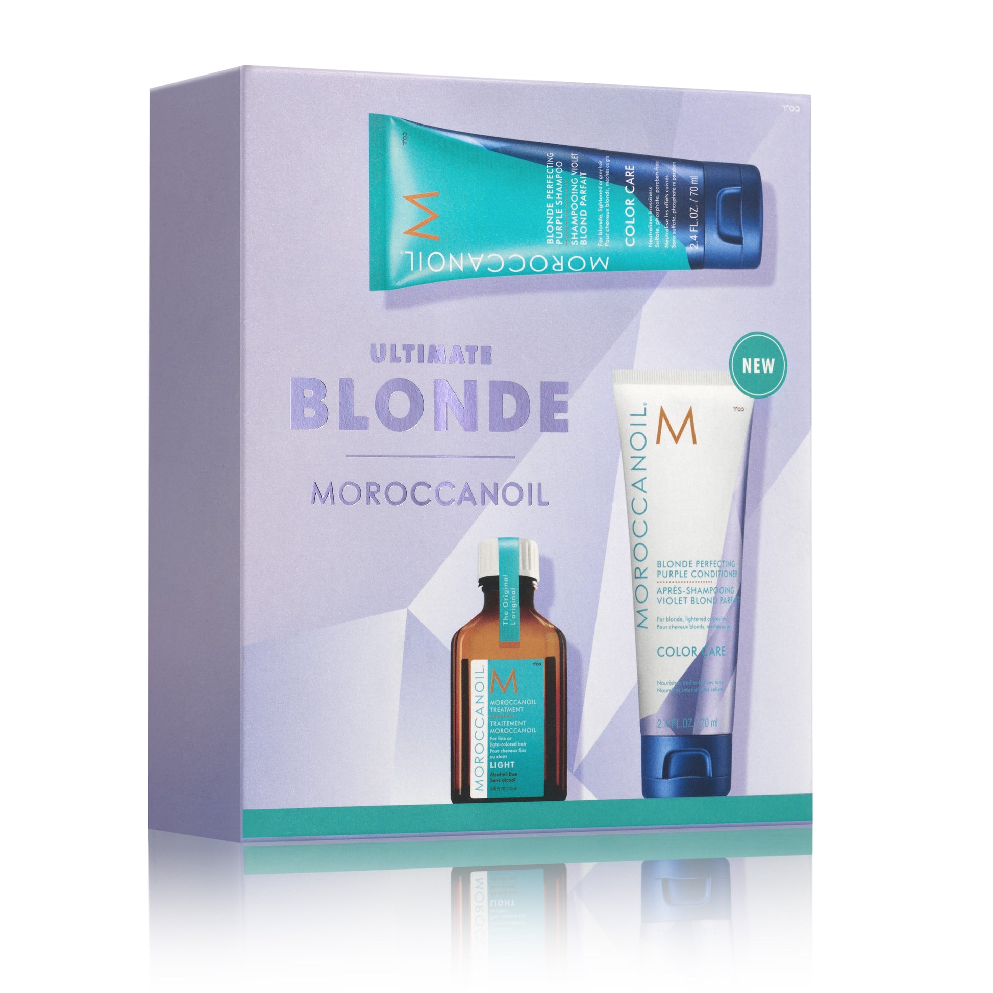 Bring out the best in blonde hair with this complete capsule collection featuring NEW Blonde Perfecting Purple Conditioner, Award winning Blonde Perfecting Purple Shampoo and the iconic Moroccanoil Treatment Light all at a very special price.